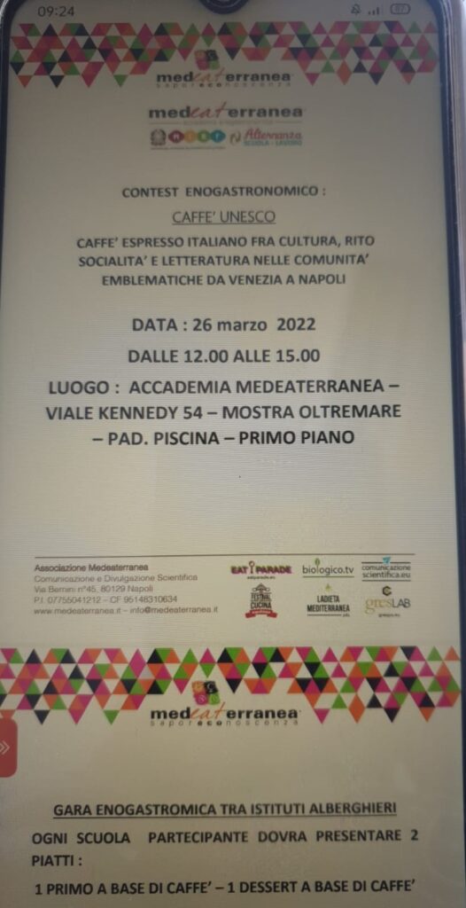 L’Istituto Isabella d’Este Caracciolo, dirigente scolastico dott.ssa Giovanna Scala, partecipa al Contest Enogastronomico: Caffè Unesco Caffè espresso italiano fra cultura, rito, socialità e letteratura nelle comunit emblematiche da Venezia a Napoli.